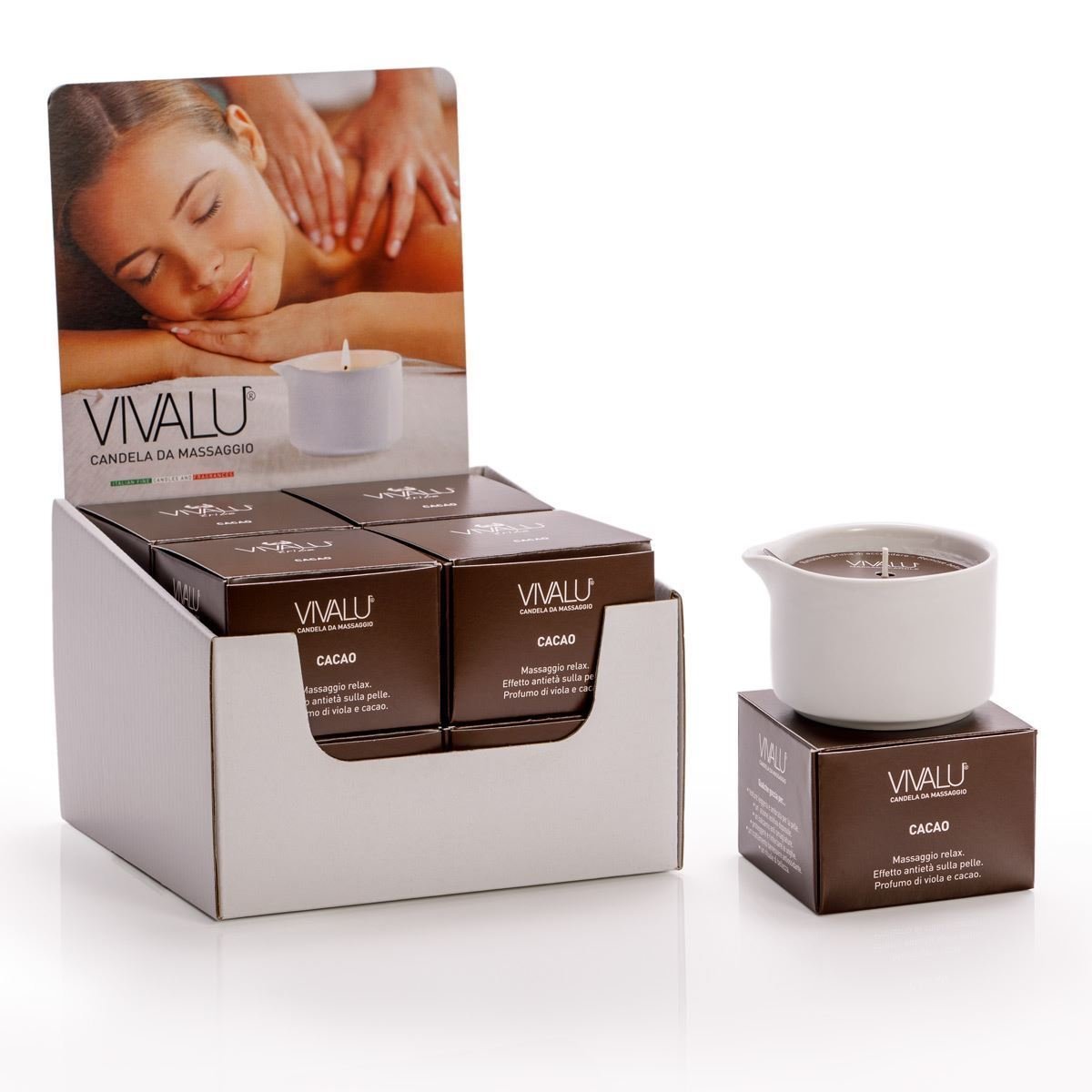 Relaxing massage, Anti-aging effect on the skin, Scent of violet and cocoa.